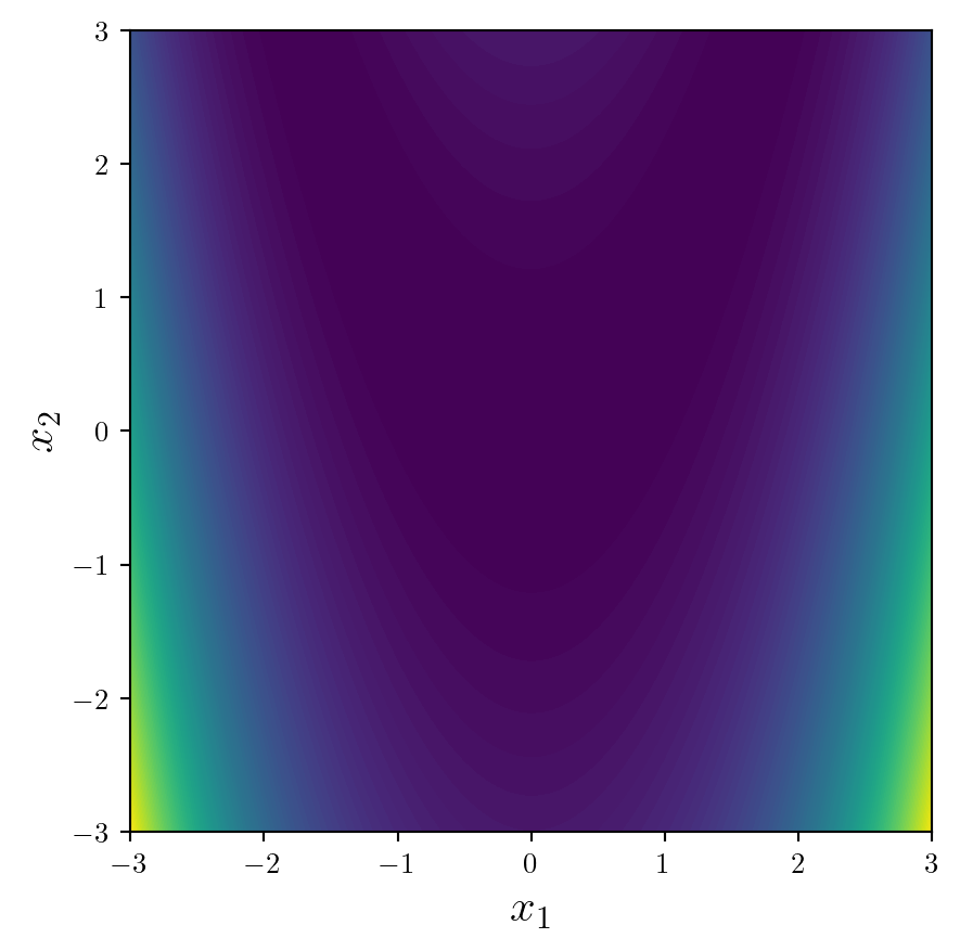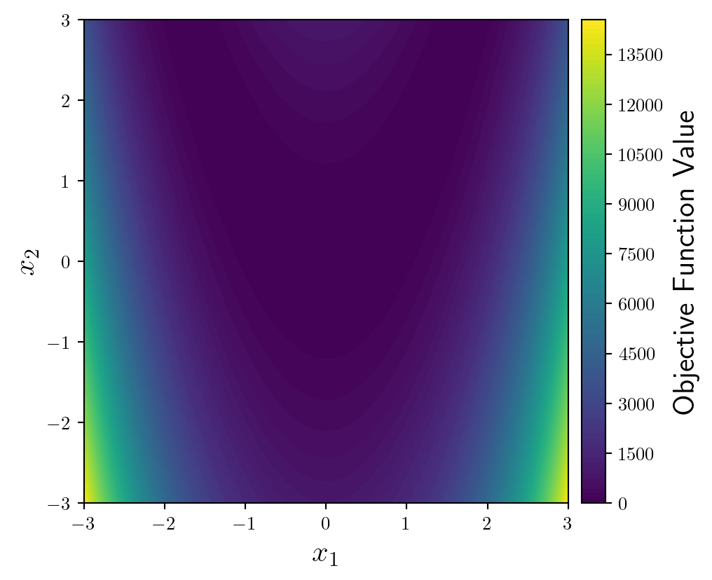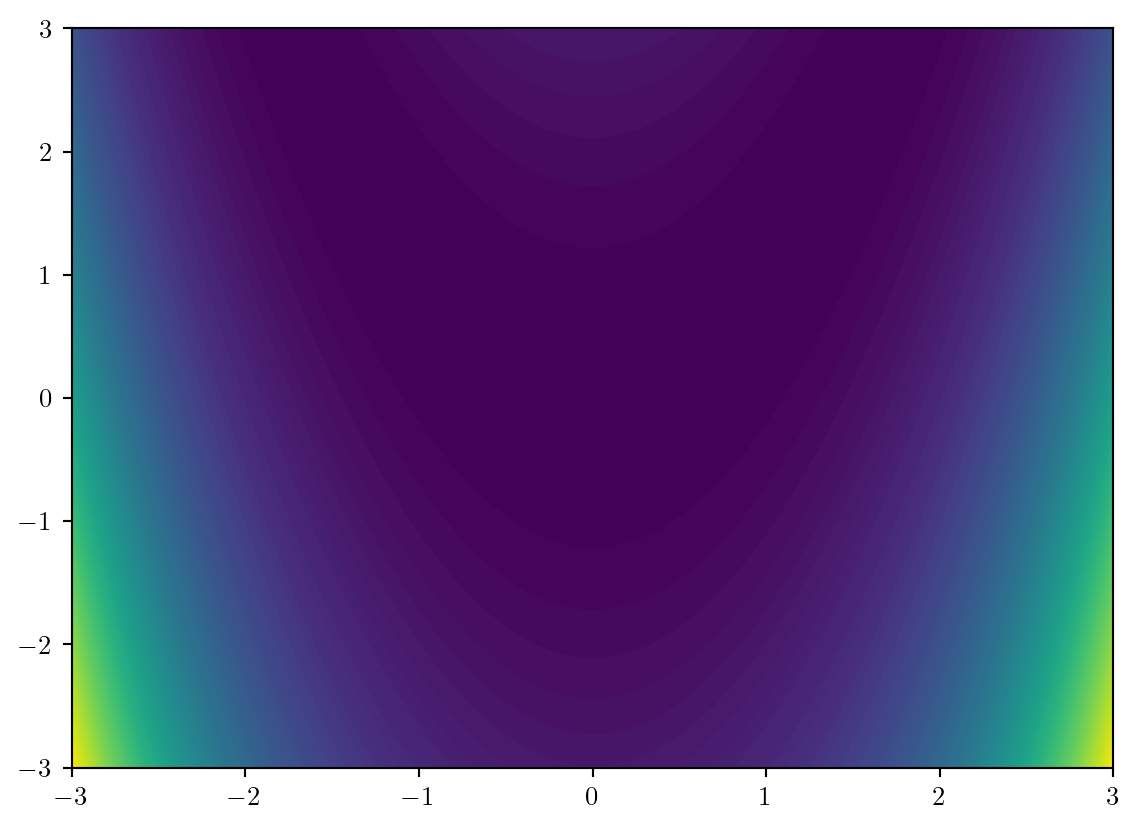 return 100*(x2-(x1**2))**2 + (x1-1)**2 +1For now we will use the bounds -3 and 3 for both x₁ and x₂. We can apply MLX's vmap functionality to really quickly evaluate an entire grid of points in parallel.