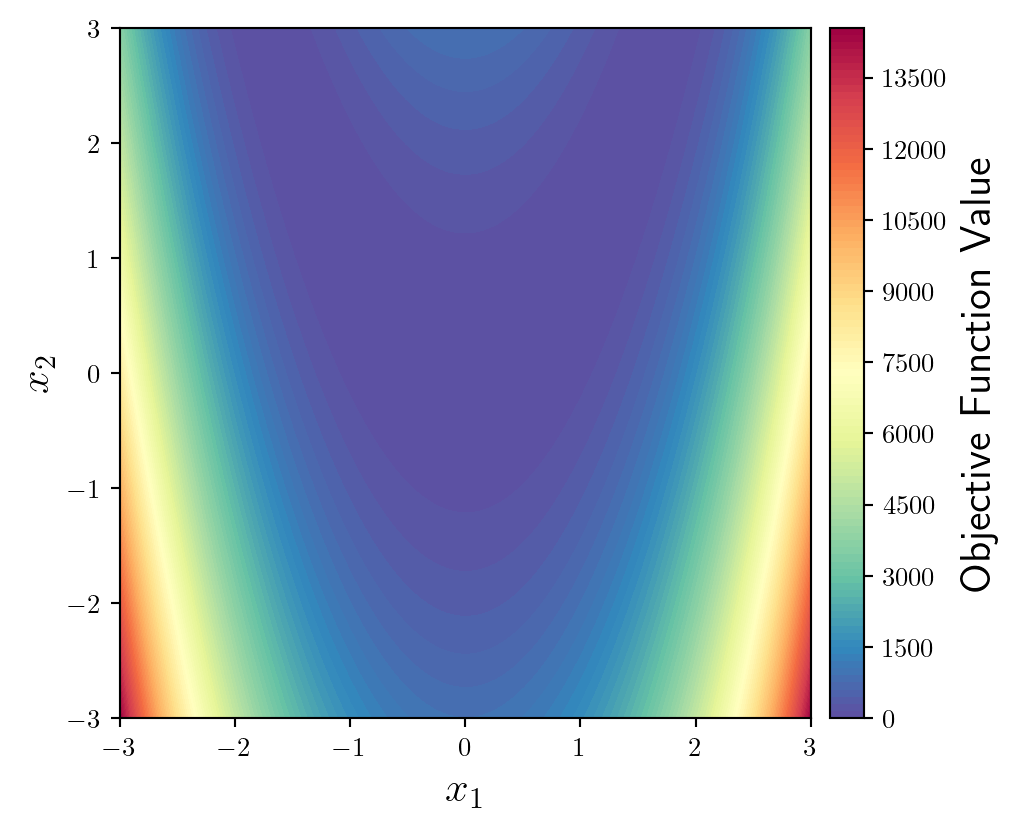 fig.colorbar(fun, cax=cax, orientation='vertical').set_label(label='Objective Function Value',size=16)Since we will be plotting an optimisation trajectory on top of this, we should use a softer, more subtle colormap. My personal favourite is Spectral (but I'm going to reverse it by appending _r).