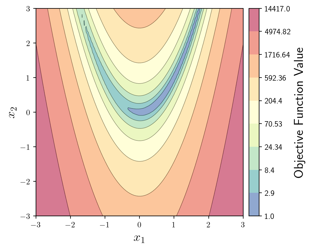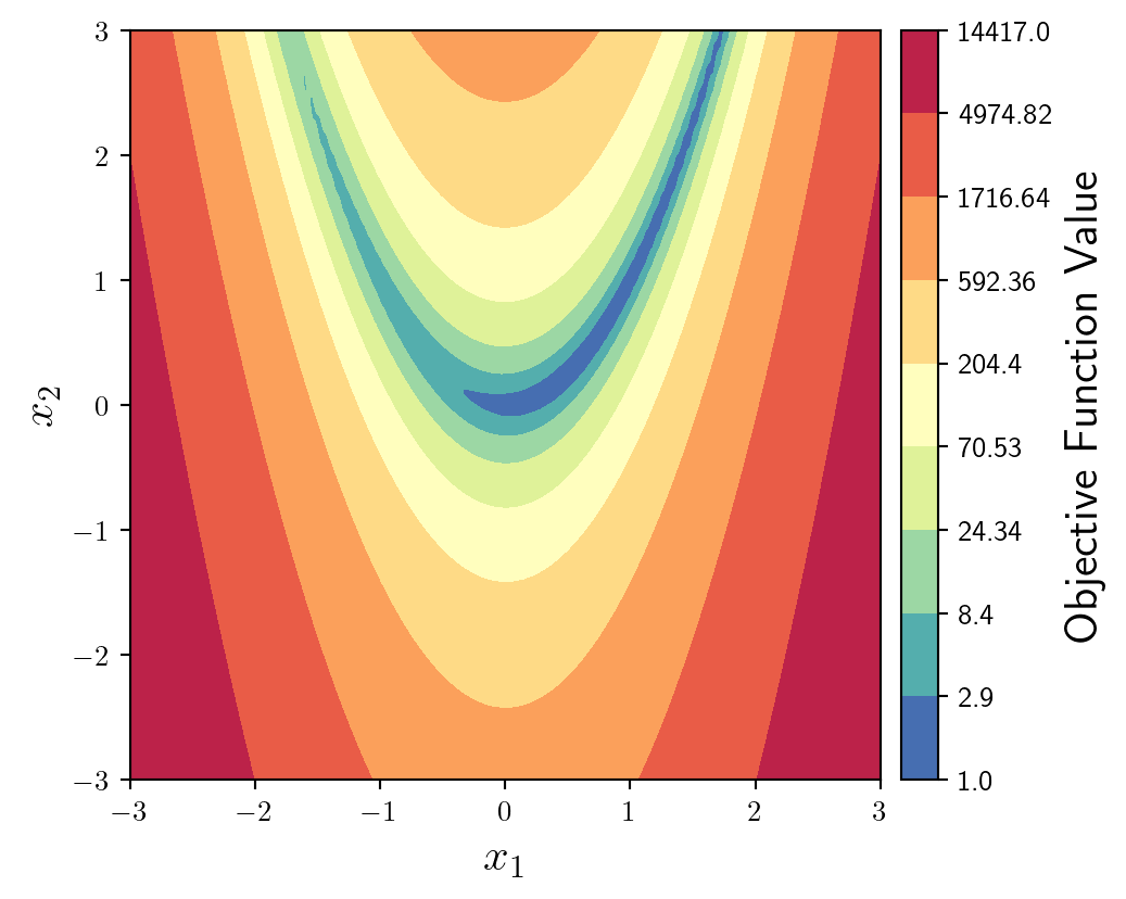 fun = ax.contourf(X1,X2,y,levels=100,cmap='Spectral_r')This function has very steep sides, with a shallow u-shaped valley. It would be better to plot the logarithm of the objective function. We can do this by defining where we want the levels to be using geomspace which creates logarithmically spaced values between the minimum and maximum values of the objective function.